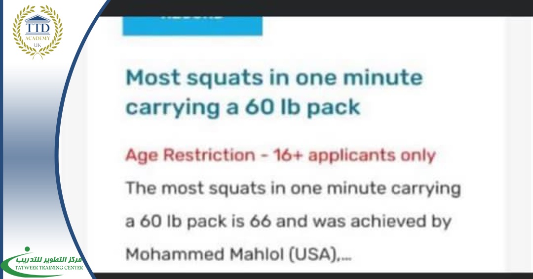 The Guinness World Records announced a new record achieved by one of our distinguished trainers at the British Academy for Training and Education TTDA Academy, Coach Mohammed Mahlol, by doing a squat exercise with 60 pounds in one minute.