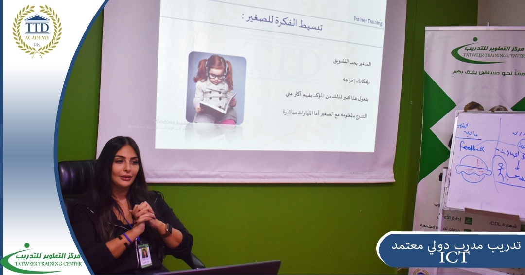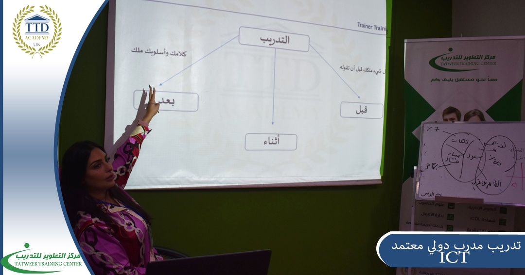 One of the most important professional trainings provided within the Development Center for Business Administration Training and Human Resources Development accredited by the British Academy for Education and Training ,TTDA Academy, is the ICT (International Certified Trainer) Training Course provided by the accredited international coach Heba Al-Ageli at a rate of 40 training hours during which a group of distinguished people is trained to learn how to become qualified as brilliant academic trainers and use the most important training theories in the world and master the ingenuity of initiation and drawing attention to the tone of voice, body language and words, and how to choose the appropriate type of training according to the training material and become brilliant and persuasive lecturers by informing them of the most important and latest psychological and social skills to graduate successfully from the Development Center for Business Administration Training and Human Resources Development according to the standards of the British Academy for Education and Training ,TTDA Academy, and apply these skills in their field of work professionally
